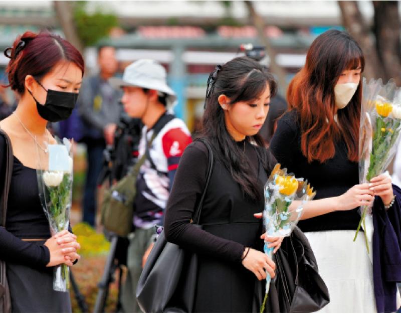 圖:市民自發前往宏福苑附近的大埔花園獻花悼念,寄託哀思。\大公報記者何嘉駿攝