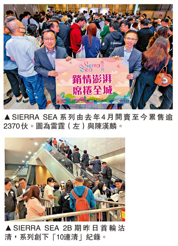 【大公報訊】新地西沙SIERRA SEA,全新一期第2B期昨日進行首輪銷售,以價單發售的165伙,逾4小時沽清,延續系列「10連清」。發展商加緊出貨應市,即晚加推價單3號涉196伙,折實平均呎價12423元,折實售價460.1萬至940.52萬元,折實呎價10168至13896元。