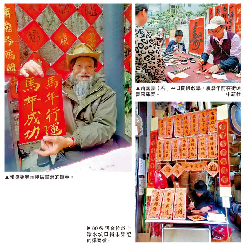 馬年揮春,怎可無馬?在上環樓梯街,荷風堂書畫院創辦人蕭嘉豪即席揮毫,以行書寫下「馬到功成」,文字旁還要畫上吉祥馬的圖案,充滿意趣。
