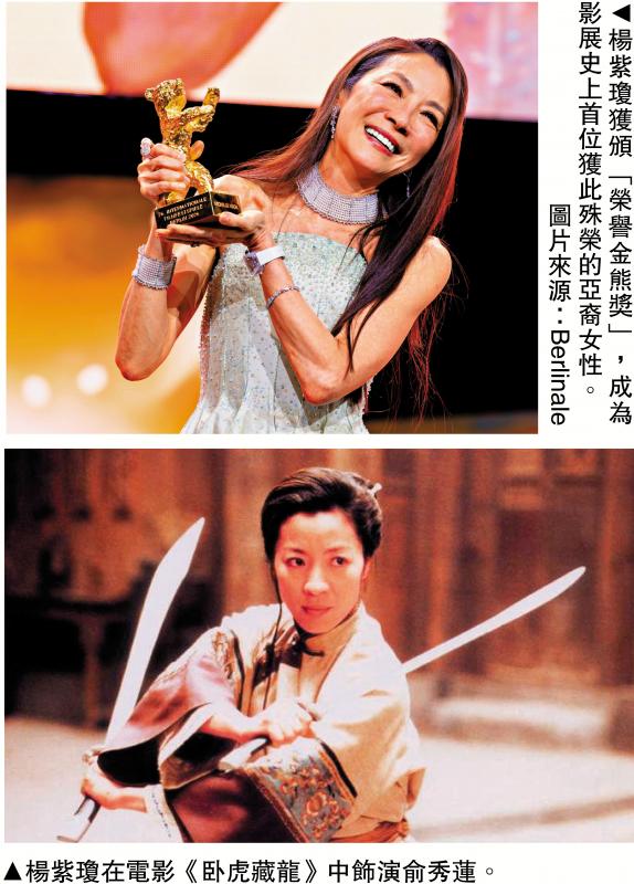 【大公報訊】第76屆柏林影展於2月13日凌晨舉行開幕禮,奧斯卡影后楊紫瓊獲頒象徵終身成就獎的「榮譽金熊獎」,成為影展史上首位亞裔女性獲此殊榮。楊紫瓊上台領獎時表示:「終身成就獎是個很有分量的詞,聽起來像是下了定論,但我寧願把它看成一種暫停,去喘息、回顧的一個時刻,接着繼續向前走。」