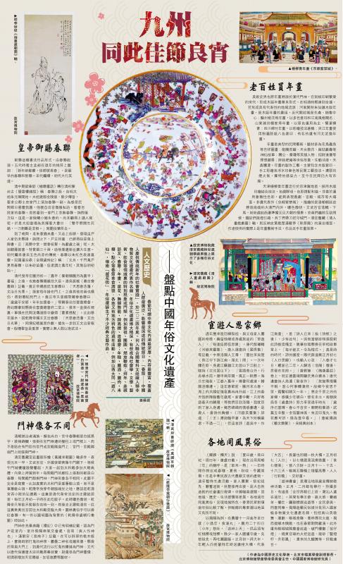 春節可謂中華文化內涵最深厚、內容最豐富、覆蓋人群最廣泛、影響最深遠的傳統節日。「春節——中國人慶祝傳統新年的社會實踐」,於二○二四年底,列入聯合國教科文組織人類非物質文化遺產代表作名錄。年俗文化遺產博大精深,有些成為社會學、文學、藝術、飲食等領域裏的特別現象或門類,例如祭祖、團圓、燃放鞭炮;拜年、走親訪友、春聯;年畫、窗花、舞獅舞龍、踩高蹺、逛廟會;年糕、臘酒、臘肉、米糖、點心等春節美食酒漿。各地又有地方特色的過年活動,例如山西大同「遊八仙」,嶺南「遊花街」。年俗還誕生了不少經典文藝作品。\姜舜源