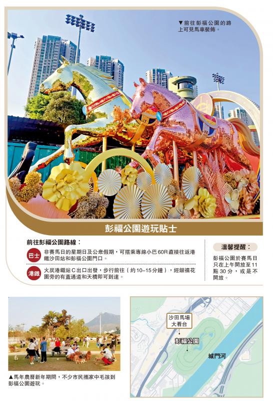 馬年到來,十二生肖中的馬成為了新一年的吉祥物。開年行大運,不妨也尋找同馬有關的好去處。每年的大年初三是香港新春活動之賽馬日,今年又恰逢丙午馬年,在馬場觀看賽馬以賀新歲之人接近10萬。來到現場會發現,除卻馬場、馬房之外,馬場中央有一片十分難得的綠地,猶如鬧市中的「綠洲」,正是沙田的彭福公園。馬年伊始,市民亦可攜帶家中毛孩,在不跑馬的日子,到彭福公園行大運、沾沾「馬」氣,期盼新一年馬到功成。\大公報記者 劉 毅(文、圖)