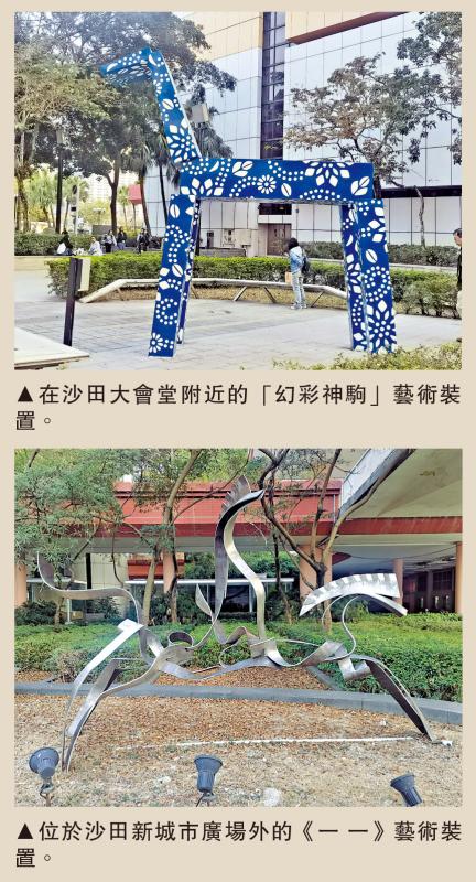 內地藝術家張宇的作品《一 一》,位於沙田新城市廣場外,不鏽鋼雕塑線條抽象,仔細看能發現這組作品依然在描述馬。張宇的創作構想是以中國古代的竹簡為基礎,利用其亦合亦分的特性,取竹簡可拆成一個不間斷的元素,從而設計了這件作品。《一 一》的兩匹「馬」遙相呼應,在「馬」與「術」之間,藝術家更強調對於「術」的表現,通過交纏和組合展示馬的動感,宛如書法的線條和韻律。