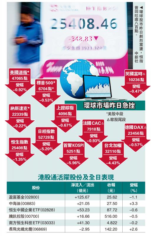 國際油價暴漲,環球股市劇烈震盪,恒指受累一度回吐851點,指數收市跌幅縮窄至348點。內地資金大舉入市買貨,港股通淨買入372億元,刷新歷史紀錄;內地資金主力掃入盈富基金(02800),淨買入規模達到125億元。華泰證券預期,港股未來半月至一月時間料呈震盪格局,短期可考慮增加避險部位。招商證券國際建議防禦為上,以高股息、有色金屬、電力為主的配置策略。證券界人士認為,港股短線適宜炒股不炒市,AI相關基建設施板塊可以看高一線。\大公報記者 劉鑛豪
