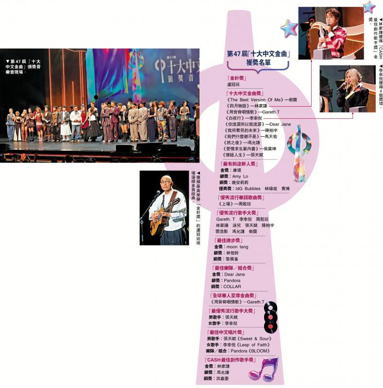 由香港電台主辦的第47屆「十大中文金曲」頒獎音樂會昨日於東九文化中心劇院舉行,今年大會以「全城傳情」為主題,安排歌手以嶄新的「音樂劇場」形式演繹得獎作品,讓觀眾欣賞香港中文流行音樂多元的曲風與創意。香港電台同時宣布「十大中文金曲」將「衝出香港」,除了將頒獎音樂會帶到內地視像轉播,更在上海舉辦《十大中文金曲─上海金曲匯》,利用音樂促進跨地域文化交流。女歌手方面,李幸倪一舉奪得4個獎項。至於男歌手,馮允謙與林家謙同樣憑作曲獎加持,各自獲得4個獎項,其中一個項目同時涵蓋主唱及作曲兩個獎項,唱片公司則以華納唱片得到11個獎項最多。\大公文匯全媒體記者 梅馨文(文)、北山彥(圖)