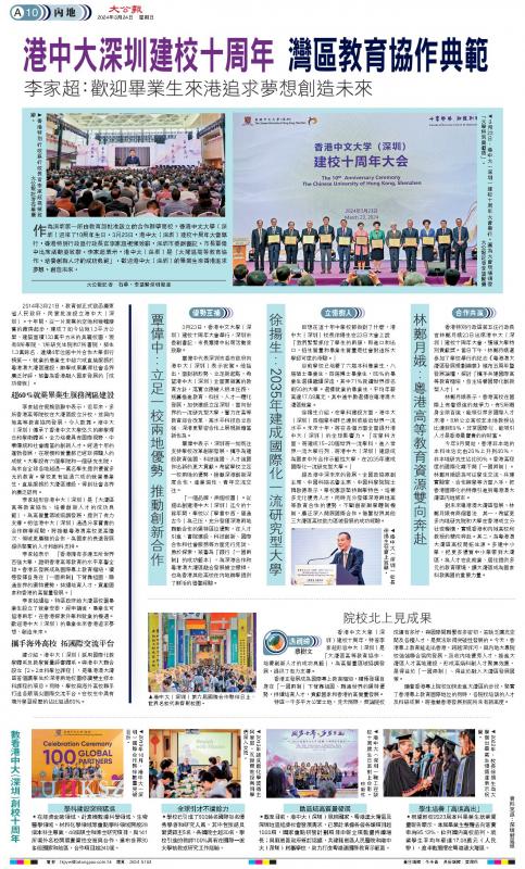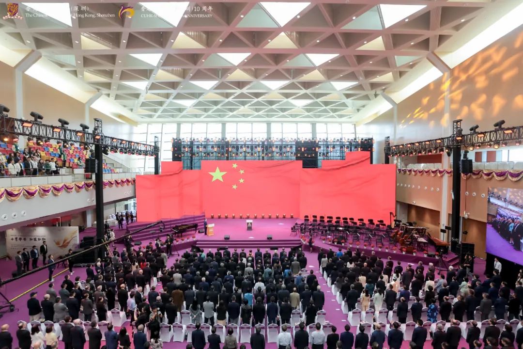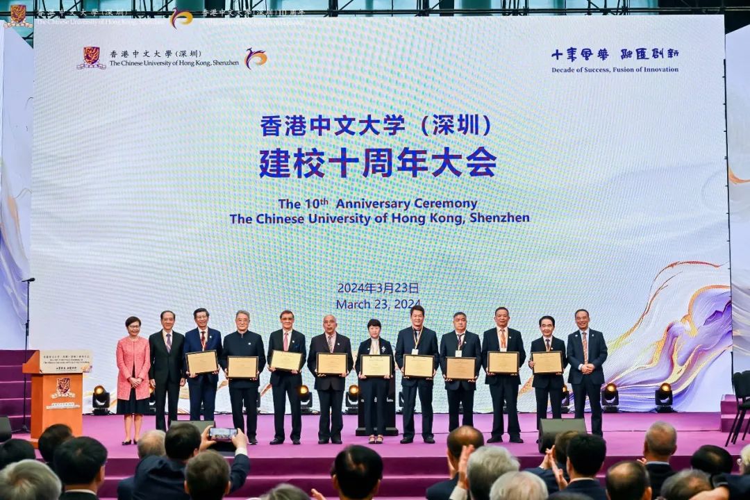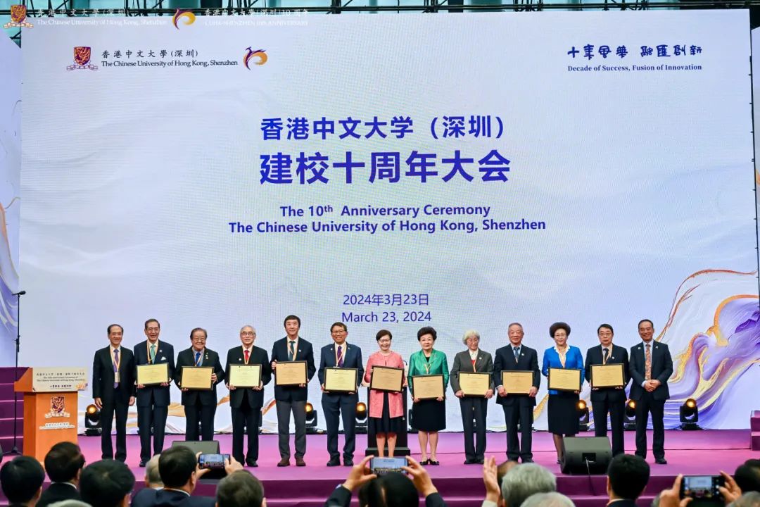 「神仙湖畔鳳鳴春熙暖,十載耕耘桃李薪火傳。」3月23日,香港中文大學(深圳)建校十周年大會暨發展論壇在大學禮文堂舉行。各級政府領導、百馀名院士、各界社會嘉賓、海內外高校代表、全球校友代表、全國各地考試院院長代表、全國重點中學校長代表、在校師生、全國各地的家長代表以及新聞媒體等,共約1000餘人歡聚一堂,以「感恩」為主題,共同見證香港中文大學(深圳)建校10周年。會後,大學舉辦了紀念《粵港澳大灣區發展規劃綱要》頒布五周年暨發展論壇,特邀嘉賓圍繞「攜手共建國際高等教育樞紐」和「自主培養國際化創新型人才」的主題進行探討。