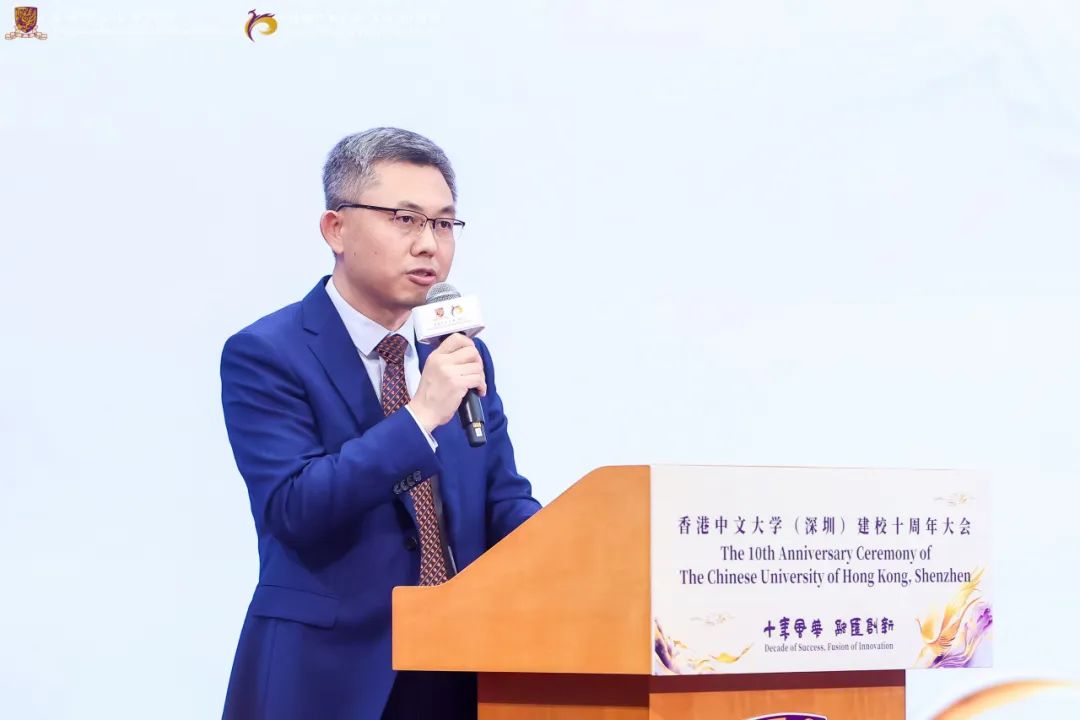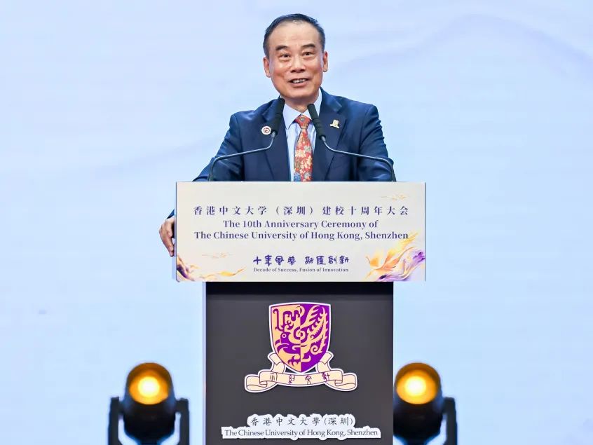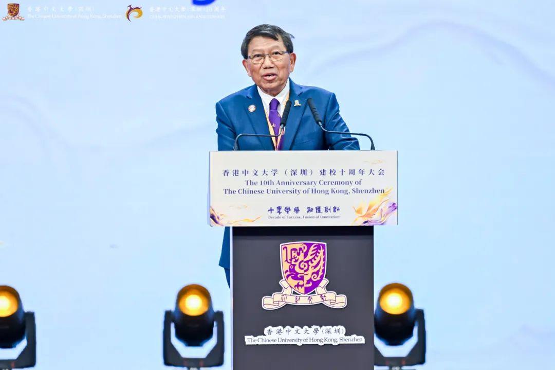 香港中文大學(深圳)理事會理事長、香港中文大學校長段崇智教授發表致辭,回望十年前香港中文大學敢為人先,作出極具歷史意義的決定,成為香港首家到內地辦學的高等院校。他充分肯定了創校十年間港中大(深圳)的辦學成果,在港中大的精神引領下,傳承學術體繫與辦學理念,為粵港澳大灣區和國家培養青年人才。一直以來,兩校同心築夢、聯繫緊密,合力打造「一個品牌,兩個校園」,為國家高等教育改革創新,是香港高教界融入國家發展的成功樣板。段崇智教授感謝教育部、廣東省及深圳市政府和香港特別行政區政府對港中大(深圳)的鼎力支持,感恩全體師生和各界朋友攜手共度艱辛的拓荒歲月,並祝願大學邁向下一個奮進十年、光輝百年。