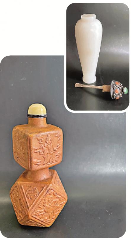 上圖:白玉瓶式(鑲寶蓋/象牙匙)鼻煙壺。\作者供圖;下圖:葫蘆八楞形(八仙紋飾)鼻煙壺。\作者供圖