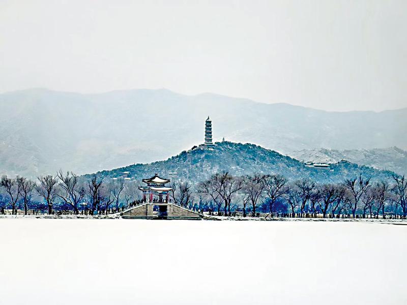 長街、公園新掛起了紅燈籠,亮起了彩樹,二○二六年第一場雪如期而至,紛飛的雪花在華燈霓虹下飄飄灑灑。這時的雪是熱烈的歡騰的。頤和園人潮湧動,擠滿了賞雪的人。然而,感覺上並不顯得人多嘈雜──路面湖面,樹上亭上,飛簷碧瓦間,銀裝素裹,蒼茫潔白,天地一片素雅。人們與佛香閣、十七孔橋、畫舫、廊亭……都成了點綴,彷彿中國畫,蒼翠江山,人間煙火,除此之外,雪覆蓋下,皆為留白。此時的雪,很安靜。