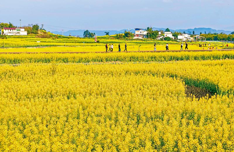 近日,遊人在四川省瀘州市瀘縣喻寺鎮譚壩村油菜花田間賞花遊玩。\新華社