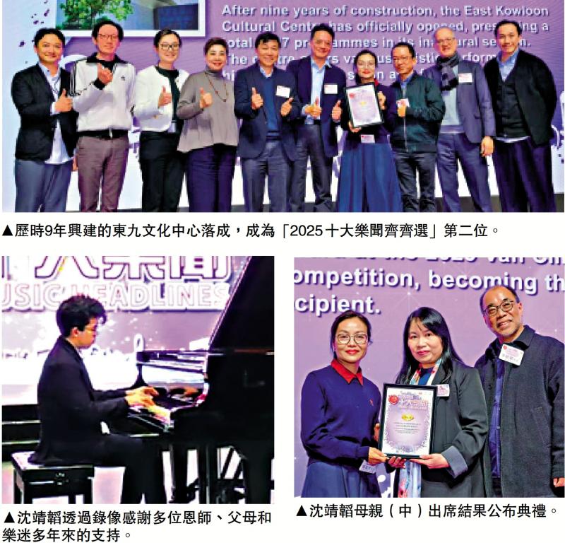 香港電台第四台主辦的「十大樂聞齊齊選」23日在東九文化中心舉行「十大樂聞齊齊選」40周年及2025結果公布典禮。「沈靖韜獲得2025范·克萊本國際鋼琴比賽金獎,成為史上首位獲此獎項的香港鋼琴家」獲得76%得票率,成為年度十大樂聞之首。\大公報記者 顏 琨