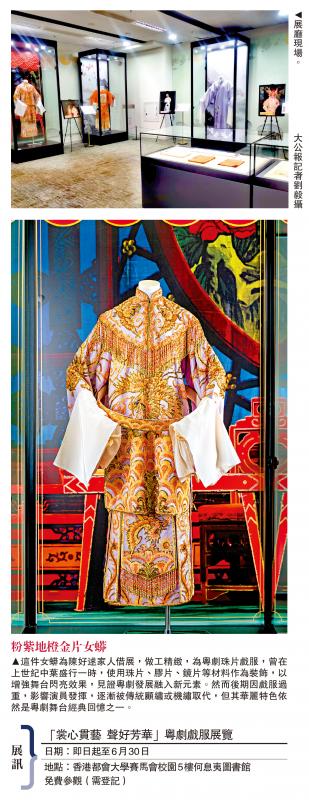 粵劇名伶穿的戲服,既是本身飾演角色的彰顯,也是「可穿戴的藝術品」,工藝製作反映粵劇發展歲月。由香港都會大學何陳婉珍粵劇研藝中心、大學圖書館及田家炳中華文化中心主辦的「裳心貫藝 聲好芳華─粵劇戲服展覽」即日起在香港都會大學展至6月30日,展出多套粵劇名伶穿過的粵劇戲服,橫跨多個行當,引領觀眾近距離欣賞戲服工藝和設計,加深對粵劇文化的認識。公眾登記可免費參觀。\大公報記者 劉 毅