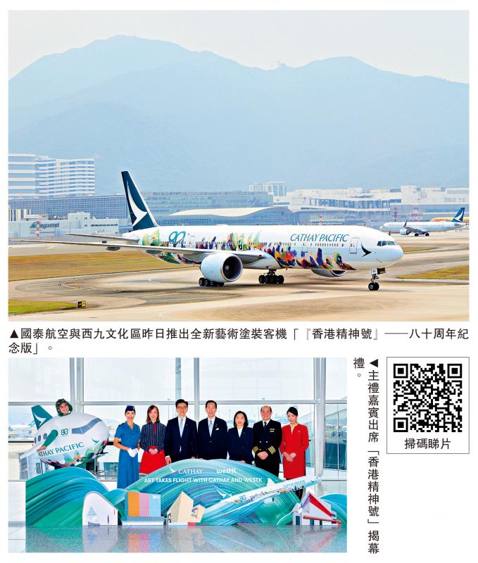 國泰航空與西九文化區昨日推出全新藝術塗裝客機「『香港精神號』─八十周年紀念版」,這亦是國泰推出的第五代「香港精神號」客機,客機以紅、藍、綠、粉色交織的山水畫為塗裝,機身上印有國泰「同心飛躍八十年」周年標誌,尾部則印有「westK」標誌。該架飛機已於昨日下午投入使用,首站飛往越南,將香港豐富的藝術文化推向世界。該架飛機沒有特定航線,任何該機型會飛往的航點均有機會到達。\大公報記者 顏 琨