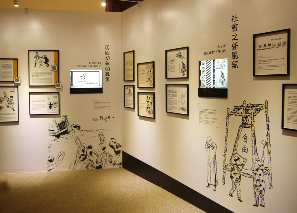 圖:「時評×幽默=辛亥革命前後的漫畫」展覽以時間為主線,同時設有屏幕展示由這些漫畫製作而成的動作短片\大公報實習記者湯艾加攝