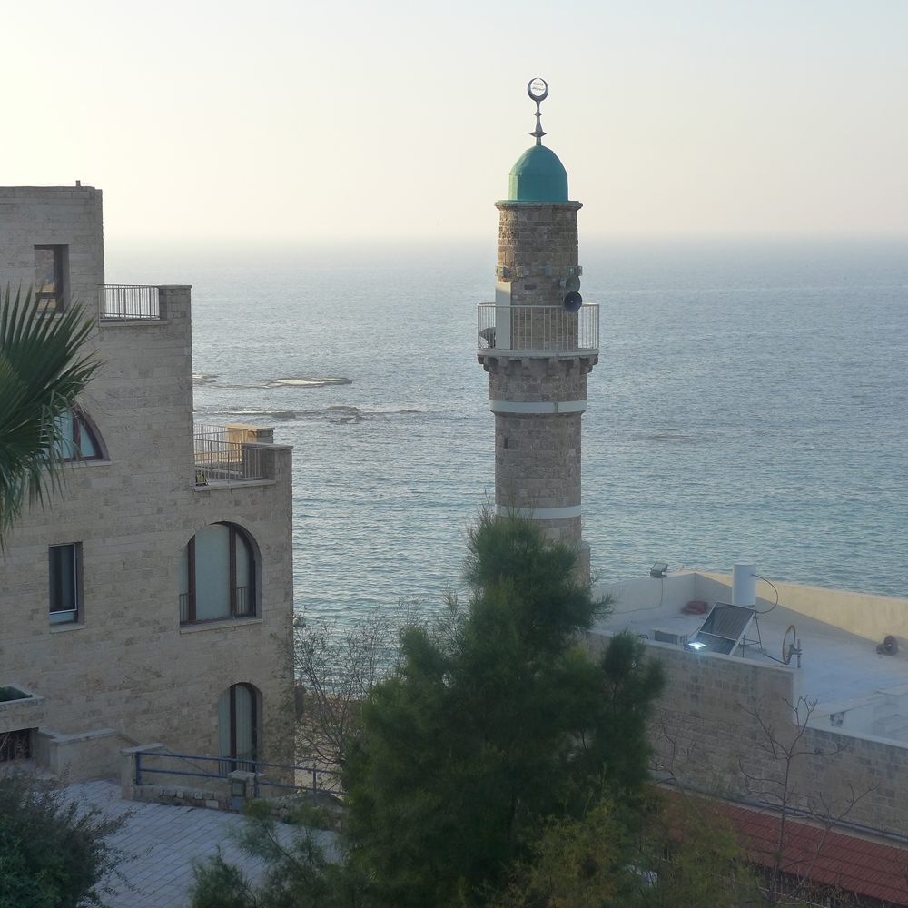 夕陽最後一抹金照鍍在築於三十七米高山丘上的雅法古城,錯落有序、米黃色為主間有紅色的石築古屋,密布斜陽下古城。年代久遠的古雅石建築,環擁古城中心凱杜明廣場。城中街巷多僅寬一兩米,鋪路方形石板踏磨沖刷得光滑亮閃。巷陌兩邊多是兩三層高老屋,其內多置小布爾喬亞品味新飾,迎合當今多數遊人意趣。古燈塔改建的清真寺宣禮塔,一身高貴金輝,默聳地中海港岸,迎送來去急勁的滄桑風雨。靜對莫測的海上雲起浪湧的古城標誌聖彼得教堂鐘樓,臨海矗立,散映金黃暖照,拂去人身上冬末夕寒。初建於一六五四年的教堂,為遠涉重洋在雅法登岸赴耶路撒冷朝聖的信徒,提供食宿,療病治傷。為爭奪雅法,不同的部落、民族、國家,屢興漫天火風血雨降此,然後又再重建古城,並留下各自文明文化宗教印記。於是有了基督教、伊斯蘭教、猶太教等宗教殿宇共立,眾民族特色兼存、不同文明文化互容、古意今趣相通的建築比鄰,構建成厚積滄桑美的雅法。