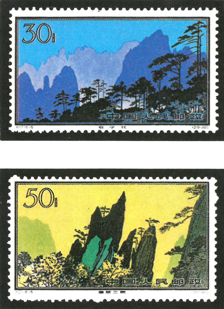 附圖為我國著名特種郵票《黃山風景》最高面值的兩枚。全套十六枚,於一九六三年十月十五日正式發行。面值五十分者,繪黃山雲海間三座小石峰,美名《蓬萊三島》;若穿過臨深壑、傍懸崖的《小心坡》及《一線天》,回首可見。徐霞客指黃山「步步生奇」。《蓬萊三島》的石峰橫空錯列,崢嶸挺立,猶如利劍斜插雲霄,另有境界。遊過黃山的郵友,對《蓬萊三島》與《天都峰》、《蓮花峰》和《蓮蕊峰》這個以《玉屏峰》為中心的東海風景區,莫不像古人般「精奪神搖,口不得語」。