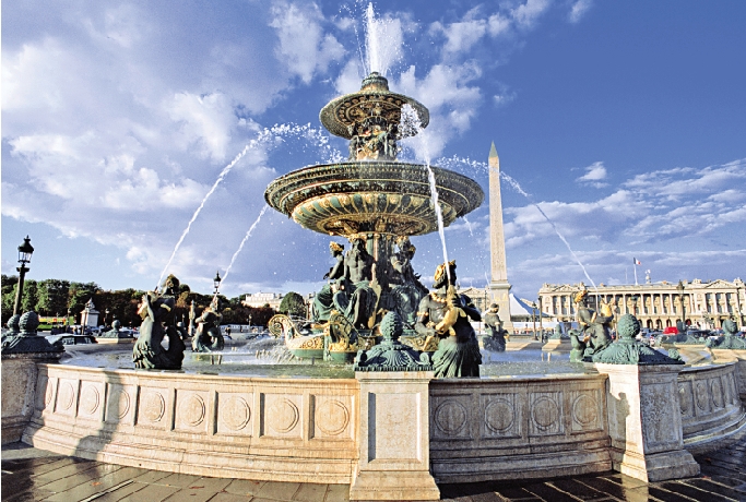 協和廣場是恢弘的,八角形的廣場周邊矗立?八個女性雕像,代表了十九世紀法國八個最大的城市。廣場上有兩座以河神與海神為意象的噴泉,其造型如同正反相對的兩隻巨蝶。儘管它是羅馬聖彼得廣場噴泉的仿製品,卻別具風姿。圓形水池中,上層是幾個稚嫩可愛的小天使;下層青銅雕塑的裸體女神形神畢肖,她們懷抱河魚或海豚,雕工精緻,造型華美,線條生動,體現了航海時代的皇家氣派。