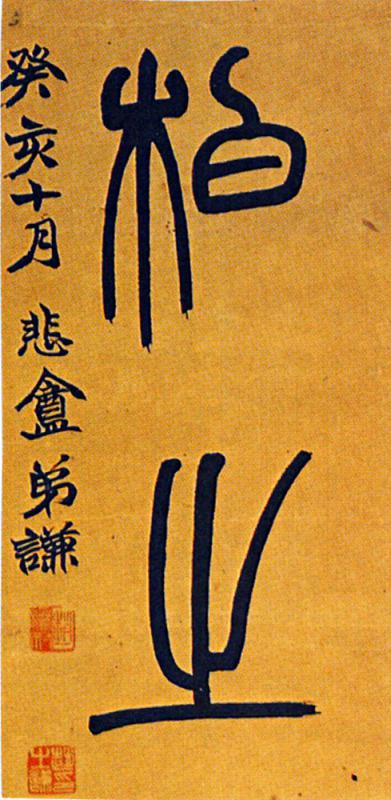附圖為晚清才子趙之謙篆書,原為一副對聯中的兩個字,書於金箋上;下款署「悲庵」,乃其別號。雖然區區二字,但可窺見其篆體獨備一格,與前朝精於篆法諸名家不同。