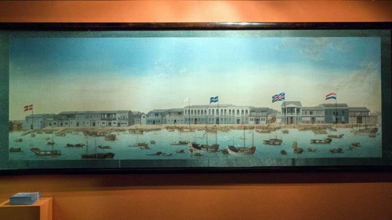 要看「十三行」的景貌,現在只能靠當年的外銷畫。這些畫作針對歐洲市場,採用西方寫實手法繪製,並結合中國傳統手卷形式。香港海事博物館最近展出一張「十三行」外銷畫,由英國東印度公司的主管在一七七四年購買,為存世最早的同類畫作之一。畫中可見商館並立,其中有五間插上國旗,由右至左分別是荷蘭、英國、瑞典、法國和丹麥。法國國旗為白色,在一七八九年法國大革命前所用,英國國旗亦有別於今天的聯合王國旗幟。