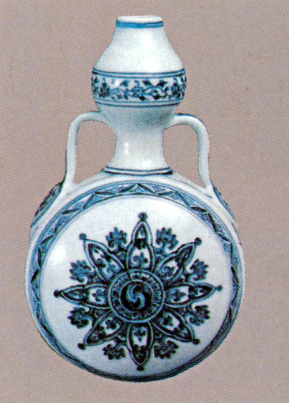 附圖為明代宣德年間燒造的青花瓷扁腹綬帶葫蘆瓶(官窰),有人稱為雙繫扁壺。這類珍罕真品,素來為收藏家覬覦;蓋永樂和宣德二朝官窰青花瓷器,可說正臻頂峰,其後各朝委實望塵莫及。