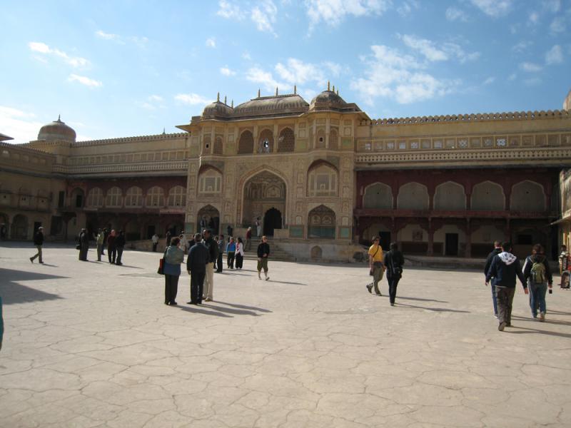 大象邁着閒悠悠的步子,載我緩緩登向高踞山巔的古宮,距山下漸遠,驀生恍若飛升天宮之感,體味到當年王公乘象上山恍若飛升時的如神飄遙。朝陽中,純白、奶白、淺黃、玫瑰紅四色宮殿石材彩光,交織成柔和煦麗之幻光,華宮玉闕恍若散放迷人幻力之琥珀建造,宮名由此得來。宮宇殿閣散映的瑰麗若夢光華,如晨陽裏雲端上印度教諸神的天宮逸散着撲朔迷離之神靄……