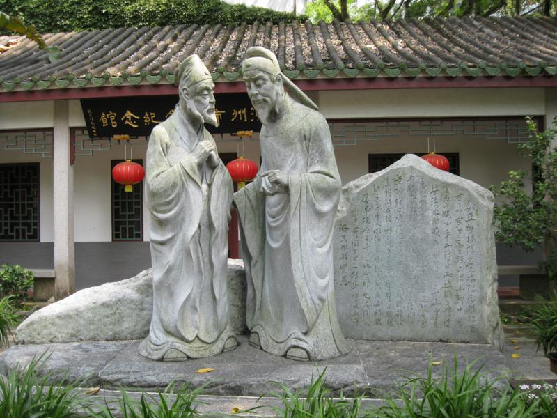小可出了祠堂南邊門,來到庭園天水園,但見兩尊老者文人雕像—韓公別趙子,兩米多高,一為韓愈,另一為韓愈友好、海陽進士、唐宋潮州八賢之一的趙德。韓愈讚賞趙德「沉雅專靜,頗通經,有文章,能知先王之道,論說且排異端而尊孔子,可以為師矣。」因而推薦趙德為潮州攝海陽縣尉。及後韓愈被調離潮州,與趙德恩義難捨,臨行依依惜別。韓愈被貶官潮州僅八個月,捐出這八個月的俸祿,鼓勵青少年進學堂讀書。此外,韓愈曾投入類似硫磺、石灰之類的東西往河中,把威脅百姓生命的鱷魚趕退。在潮短短八個月,雖難說有什麼特大貢獻,但他對農桑、水利及民俗文化作過深入研究,當年沒做完、沒有做的事,歷代潮州人和州官都在做,而且不少做得更好,這就是韓愈長遠的影響力。上述兩個雕像的神情氣概,似有說不完的話語、訴不盡的衷情,也反映了潮州人對韓愈不捨之情。