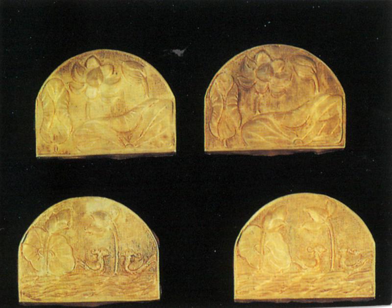 例如附圖,為遼人於唐、宋期間鏨刻的黃金腰帶飾片(四片僅屬全腰帶局部),看去像浮雕了花鳥紋與動植物紋,精細別致;造型也具契丹族傳統風格。那時遼人不斷地吸收唐朝中原地區的錘鍱與鏨刻技術;尤其是以金銀器為主,飾片相比較少。契丹族前期乃仿唐朝盛世金銀器紋飾,但造型方面另具一格。像一九七九年於內蒙古赤峰出土的魚龍提樑壺,在提樑兩端各套入展翅小鳥形器耳。另一鹿紋馬蹬壺,提樑作雞冠式;充分顯示他們日常生活中所接觸的小鳥、鹿與馬蹬。金飾片中,也有典型契丹族日用的皮囊壺式樣,與其鏤雕的北方纏枝花草紋,深富契丹族的文化傳統。於內蒙古哲里木盟遼陳國公主墓中,所出土的各類黃金首飾和八曲花式金盒,堪稱為表表者。