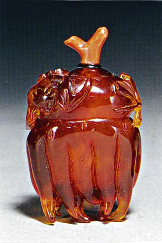 附圖為晚清時期名家精雕的琥珀鼻煙壺,配粉紅珊瑚蓋鈕,壺蓋上方雕一雙蝙蝠(諧音「福」),壺身作佛手形(諧音「福壽」),寓意皆吉祥;原為那時富貴人家賀壽厚禮。最珍貴的並非圓熟巧妙的雕藝,而是琥珀本身的品質和級數。這是較稀有難得的「金珀」。自古以來,琥珀因產地、品種、顏色與品質等不同,分很多等級。以「眾珀之長」的上等瑿珀為例,黑色外層較薄者,便不夠「老」。明代李時珍《本草綱目》有載:「瑿,即琥珀之黑色者,或因土色薰染,或是一種木瀋結成。」「古來相傳千年為瑿,狀似玄玉,出西戎,大則方尺,黑潤而輕。」其實,老瑿珀形成遠逾「千年」;據考古學家證實,距今約四千多萬年前,即第三紀初生代至中生代時期,已開始慢慢地形成,經歷後來大冰河時期而硬化,樹脂化石四周積聚天然黑色風化層。若於強光下照看,黑色風化層內,乃呈血紅色;原來老瑿珀本為「血珀」,內蘊精光,又亮又活,名副其實為「黑裏紅」。