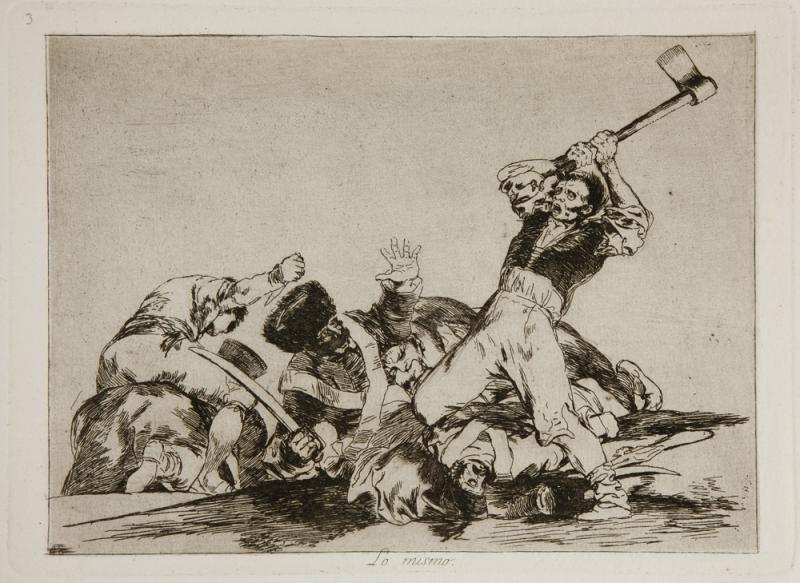 戈雅在描繪戰場時,雖然選擇了諸如行刑、槍決以及強暴婦女等不同場景,卻無一例外以「堆疊」方法畫成。畫中人與物件常常是擠壓在一起,互相纏繞,互相撕扯並制約,以至於這些作品雖然只是黑、白兩色,卻因畫家構圖與意象排布的恰切,生出一種巨大的張力。我曾在某次拍賣預展現場見過戈雅的素描小品,感慨於畫家功力之深。他以寥寥數筆,畫一位洗衫婦女在風中翩飛的衣袂。只是這被風吹起的衣衫以及踮起腳的背影,便描畫出十足的小女兒情態。而在這一系列戰爭畫作中,最引我注意的是畫中人的眼神。不論侵略者傲慢與放肆的目光,抑或被侵略者眼神中的孤苦無助,都極其傳神。