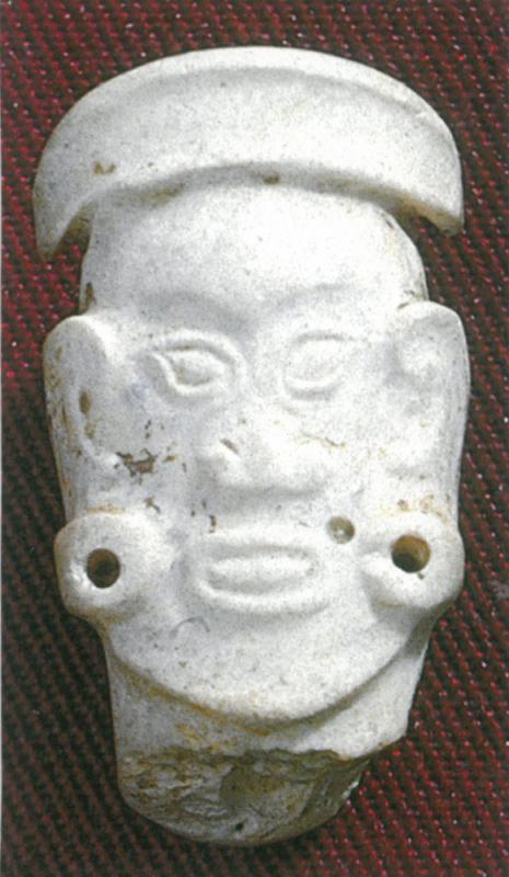 附圖則為新石器時代青龍泉三期文化的玉雕人頭像,於湖北荊州六合出土,乃天然灰沁鈣化的珍品,現藏該省博物館內。其雙耳有孔,頸(有斷口)為圓筒形,可套入他器;料屬佩飾。