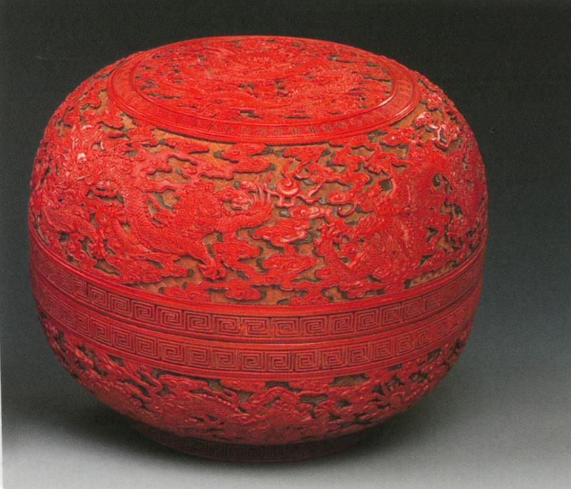 像附圖,為乾隆時期結合剔紅與剔彩之長,雕成九龍紋圓盒(直徑廿七公分)。其色澤鮮妍,錦地細密多姿,刀痕深峻陡直,棱角較明顯;雖不如明代永樂者渾厚古樸和溫潤自然,但工巧,如神乎其技。器底刻有國號年代款。清代剔紅與剔彩漆器有年款者,僅乾隆一朝,填金富厚,位置大多居於正中。嘉慶以後,雕漆工藝已趨式微。