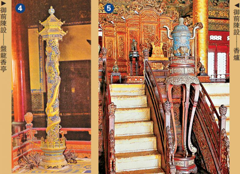 金漆寶座所在的高台階兩側,成雙成對地設置銅胎掐絲琺瑯寶象、甪端、仙鶴、香亭四種陳設;寶座階前的大殿地面上,則有四尊銅胎掐絲琺瑯香爐,一字形置放在紫檀木貼金幾架上。(圖三至五)這些御前陳設,有的是神鳥異獸,有的是仿古彝器,但都具有吉祥、安定的寓意。舉行大典時,又有縷縷輕煙從中裊裊升起,檀香四溢,有如仙境,太和殿於神聖中更增添了幾分神秘。