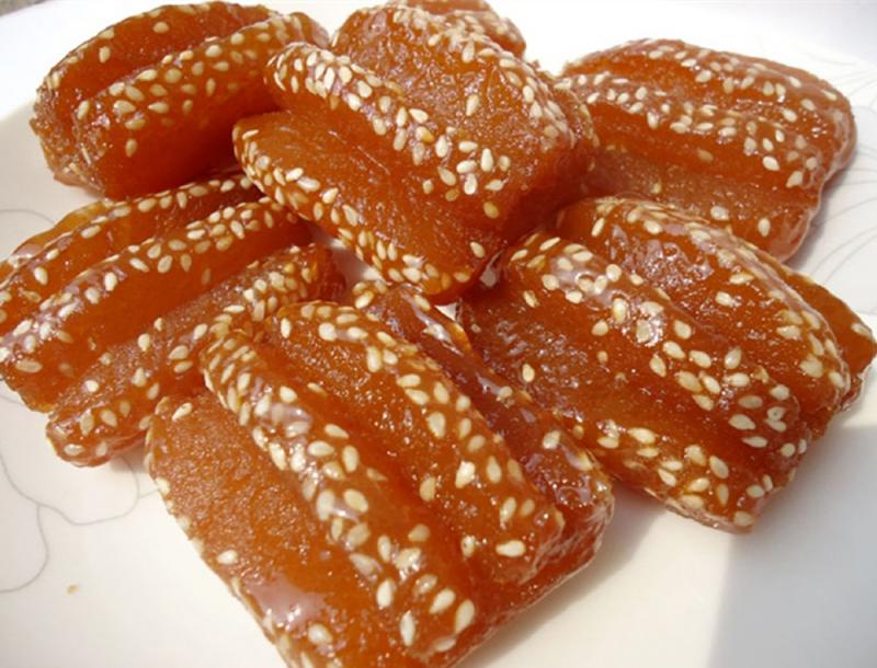 打開包裝盒,誘人的香甜味撲面而來,裏面是十多塊蜜三刀,長方形,小餅乾大小,但比餅乾厚多了,微微隆起的上面,都有三道刀劃的印痕,「蜜三刀」的名字大概緣於此吧。油汪汪的蜜三刀上面,還沾滿了密密麻麻的芝麻。一看到這蜜三刀,還沒品嘗,涎水就溢滿了一嘴。妻子勸我:「這東西油多糖多,你還是少吃點吧,防止高血脂、高血糖、高膽固醇。」我哪管這些,吃了一塊又一塊,油香,芝麻香,蜂蜜、飴糖和白砂糖的甜,美味雜陳,難以形容,直吃到盡興而已。