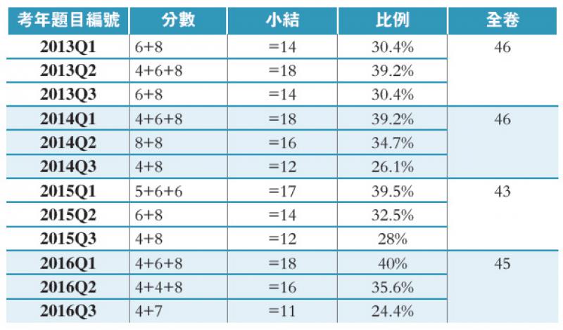 分數安排方面,本年的分數比過去三年有所減少。雖然變動不大,但同學回答時也要多加留意,注意分數比例變化影響作答時間安排。