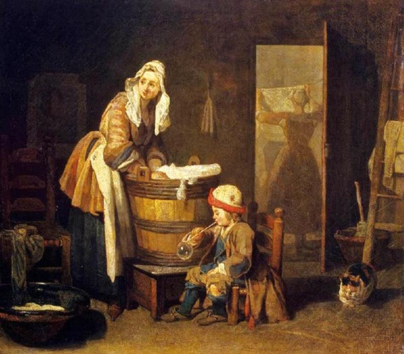 法國畫家夏爾丹(Jean Siméon Chardin,一六九九─一七七九)曾在一七三○年前後創作過一幅名為《洗衣婦》的畫作。身為十八世紀歐洲最為重要的靜物畫家之一,夏爾丹對於日常生活中的小細節與小情趣,有着與生俱來的敏感。他喜歡用極其寫實的筆法,描摹桌上的物件與吃食,比如剝成兩半的橘子、石榴或核桃,紋飾華美的水罐,有木塞的玻璃瓶,以及掛在鐵鈎上、等待成為人們盤中美餐的鰩魚。一七三○年前後,不知是否因為作家即將結婚的緣故,他開始關注諸如煮食和洗衫之類的家居場景,並將其呈現在畫布上。