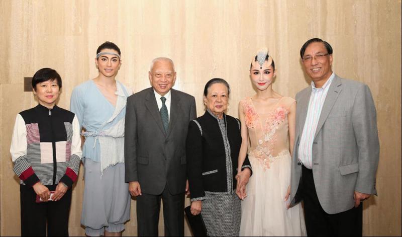 圖:董建華夫婦(中)、李小林(左一)和上海歌舞團團長陳飛華(右一),以及朱潔靜(右二)、王佳俊(左二)兩位主演合照/上海歌舞團供圖