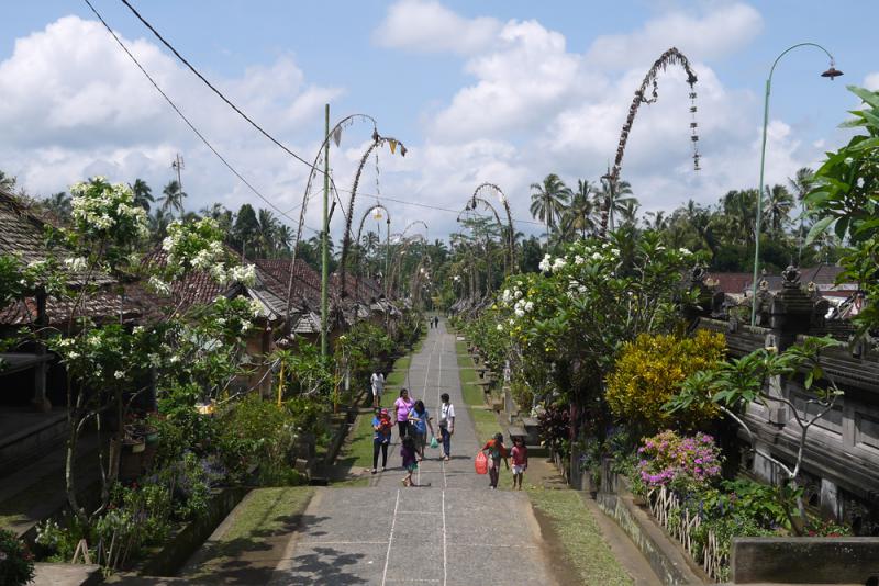 第三天我們只是參觀了峇里民俗歷史村莊,這是第一次遊覽,感覺特別好。村莊四四方方的,很整齊也很有特色。峇里人的住屋門面都有雕刻裝飾,紅磚灰石,不時有花樹探出頭來,要不然就擺有一些玫瑰茉莉花瓣在地上祭神,較講究的,屋宇前還有神像。屋宇前有不少峇里婦女在招徠,原來幾乎百分之七十的住家,也都在屋裏營生。或者賣印尼飯,或者闢成咖啡室,賣些茶水。我們走進一家,庭院深深,情調濃郁,我們一直走到最深處的咖啡室,邊喝印尼茶邊吃番薯糕點,也休息了一會。