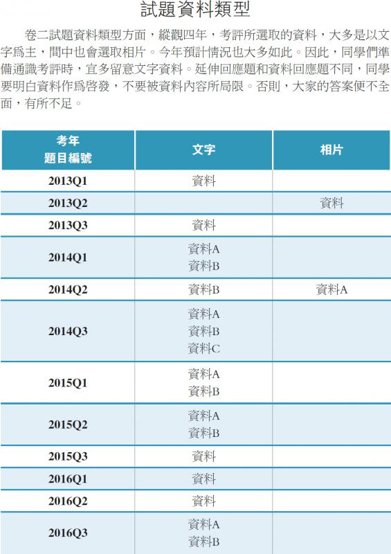卷二試題資料類型方面,縱觀四年,考評所選取的資料,大多是以文字為主,間中也會選取相片。今年預計情況也大多如此。因此,同學們準備通識考評時,宜多留意文字資料。延伸回應題和資料回應題不同,同學要明白資料作為啟發,不要被資料內容所局限。否則,大家的答案便不全面,有所不足。