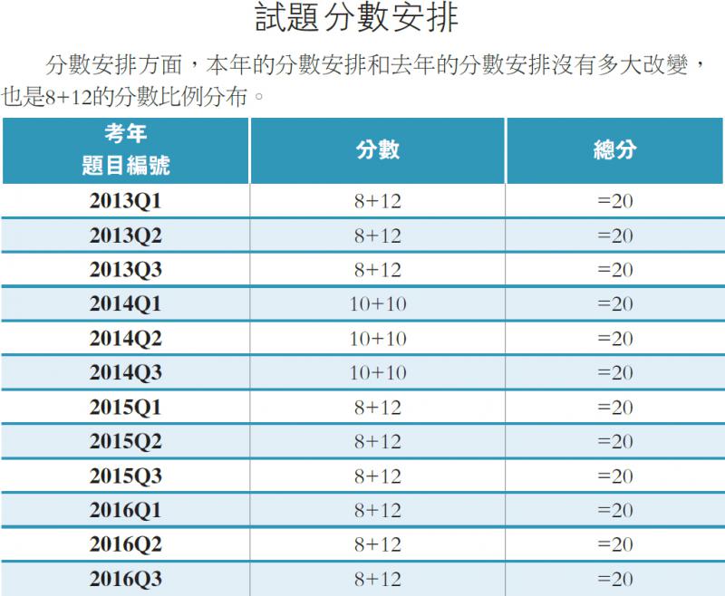 分數安排方面,本年的分數安排和去年的分數安排沒有多大改變,也是8+12的分數比例分布。