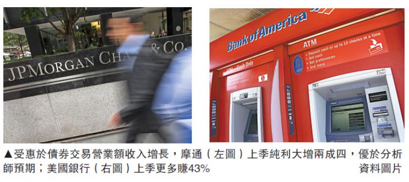 美國資產值最高銀行摩根大通昨日公布上季純利增至67.3億美元,增幅為兩成四,每股盈利亦由1.32美元升至1.71美元,優於分析師所估計。業績優於預期,主要是期內固定收益交易收入大升三成一,至33.7億美元,多於市場平均估計的32.6億美元。原因是特朗普勝選和英國脫歐等黑天鵝事件,令金融市場大幅波動,使交易營業額增加。整體營業額亦增加了2%,至243億美元,略高於彭博社分析員估計的242億美元。