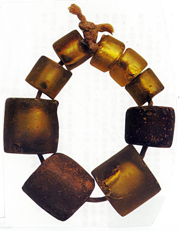 西漢的玉珠不但質佳,琢法多變,特具溫潤細結的美感,更有創新的組合。例如附圖,為西漢時期別出心裁製作的金箔玉珠,把金與玉結合一起,組成珠串,名副其實喜結「金玉緣」,是極罕的瑰寶。以甚薄金片緊密包貼在大小不一的短筒形玉珠周圍,經久而不脫落,其實難度甚高。蓋玉質與一般銅質、木質迥異,不易「貼金」牢固。可惜的是金箔包貼了顆顆玉珠後,人們眼前便只見金箔,卻看不見美玉的廬山真面目了。