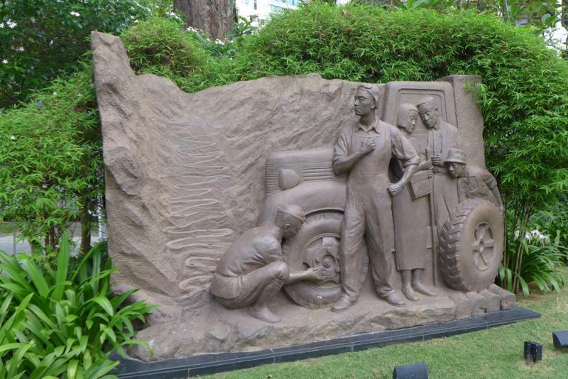 這座雕塑與什麼歷史事件有關?原來抗日戰爭在1937年爆發後,獅城成立了「南洋華僑籌賑祖國難民總會」,由僑領陳嘉庚擔任主席。他在1939年2月號召南洋機工到中國後方支援抗戰,約3200多名機工響應號召回國,以駕駛員和維修員為主,其中包括多名非華族志士,史稱「南僑機工」。他們分批從新加坡出發,其後馳騁於險峻蜿蜒的滇緬公路(長1146公里),負責運送物資前往中國,為抗戰作出了貢獻。1939至1942年間,約1000多名機工在滇緬公路犧牲,碑文論道:「他們以青春生命譜寫了抗日戰爭的悲壯史詩……這種捨生取義的精神,當為世人景仰,具有崇高教育意義!」
