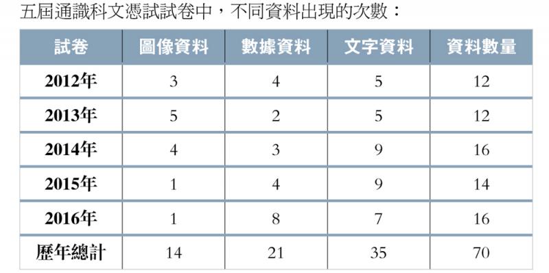 五屆通識科文憑試試卷中,不同資料出現的次數: