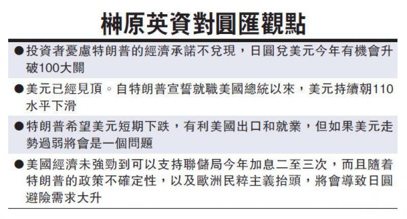 有「日圓先生」美譽的前日本財務省高官榊原英資表示,由於投資者懷疑美國總統特朗普對經濟的承諾未必兌現,日圓兌美元今年有機會升破100大關。他強調,如果美元走勢過弱,對美國而言,將會是一個大問題。\大公報記者 鄭芸央 李耀華