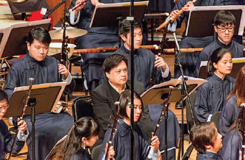 圖:坐在中樂團團員中的陳明志負責《我愛香港紅白藍》裏的人聲部分