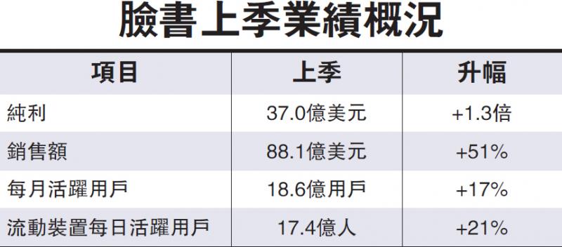 臉書上季業績優於大部分分析的預期,上季錄得純利37億美元,較去年同期的16億美元高逾一倍,銷售額則報88.1億美元,較去年同期上升了五成一。分析師原估計,臉書上季銷售額平均為85.1億美元。 另外,臉書每月活躍用戶按年上升了7000萬,增幅一成七,至18.6億用戶;每日活躍用戶則為12.3億人,而流動裝置每日活躍用戶亦增加至17.4億人,較去年同期上升了兩成一。