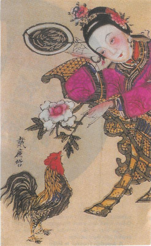 附圖為我國南方民間老版套色年畫。左下方一公雞昂首高唱。古人視雞為吉祥,蓋「吉」與「雞」諧音;而「雞者,稽也,能稽時也」;所謂「守夜不失時」(《韓詩外傳》語),「雞鳴一何貞」(語見唐代李頻詩句)。