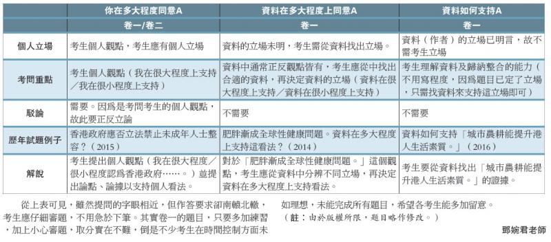 2012年是新高中第一屆文憑試,當年一如所料,大致上出現有描述數據題、解釋原因、分析及多大程度同意觀點等題型,到2013年,突然出現了一題有關「全球肥胖」的「資料多大程度支持看法」令不少考生答錯題目痛失分數;其後,這題型出現頻率愈來愈高、更出現「變種」,例如2016年考問「資料如何支持某看法」,可見這題型將成為常態,各考生理應認真學習作答技巧。