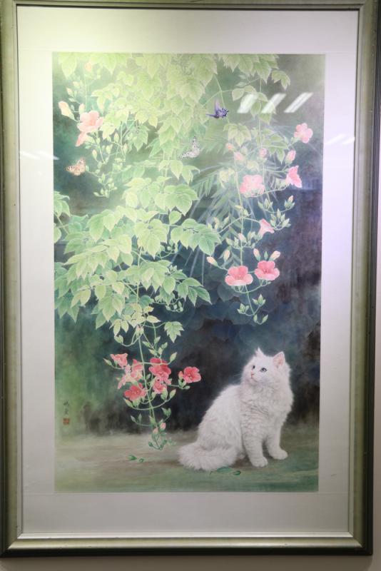 另外,是次展覽的亮點還包括展出的數幅邢誠愛的貓工筆畫。邢誠愛筆下的貓,神態嬌俏,毛髮逼真,運筆細緻,汲取了中西畫的各家之長,創造了一種獨家的表現手法,也延伸了中國工筆動物畫的寫實技巧。如是次展出的《嬉蝶》,白貓身上的毛髮,細緻逼真,而透亮的藍色眼睛專注地望向花間飛舞的蝴蝶,可見邢誠愛對貓的觀察入微。展覽現場也數該畫最引人駐足,還有部分來觀展的畫友一同近距離觀察該畫,討論其工筆畫技法,不時發出讚嘆。