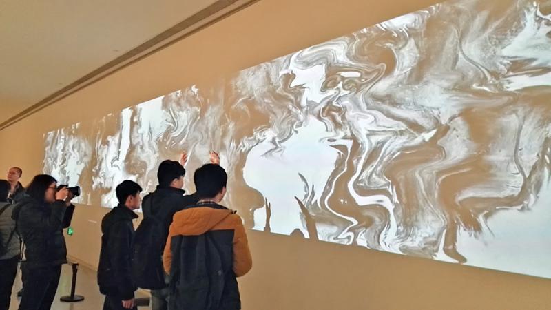 「觀眾作為能量源,能夠參與作品的再創作。」任敏告訴記者,這個最新科技的藝術表現原理是利用水墨的運動和擴散等流體現象,實時高速地計算流體產生的演化,實現觀眾與畫作的實時自然互動。
